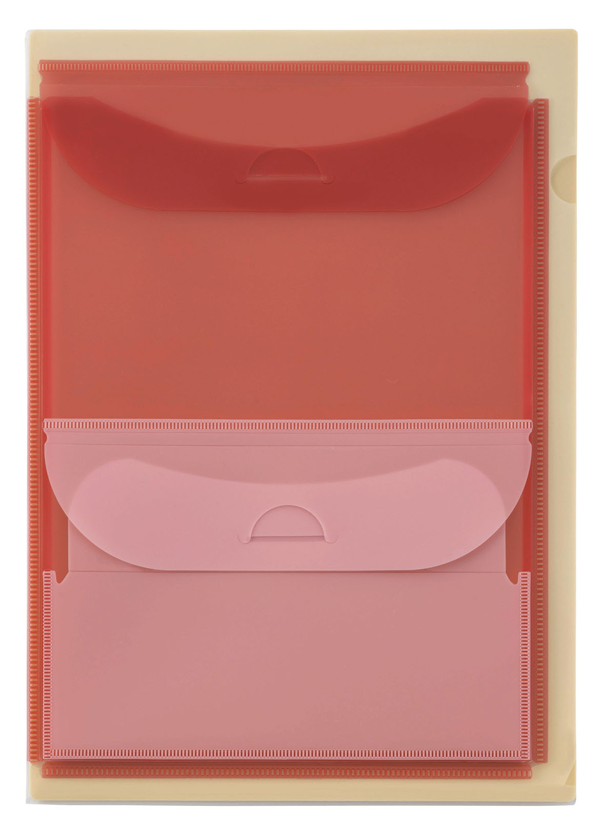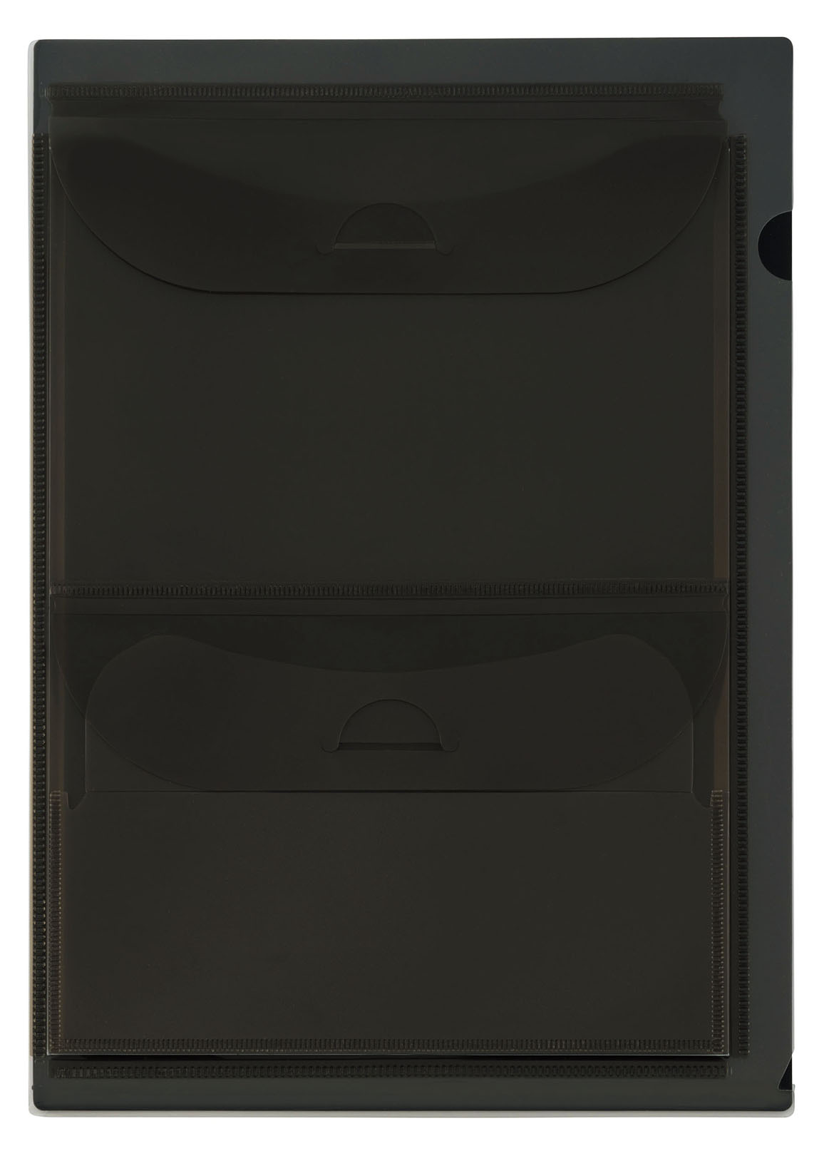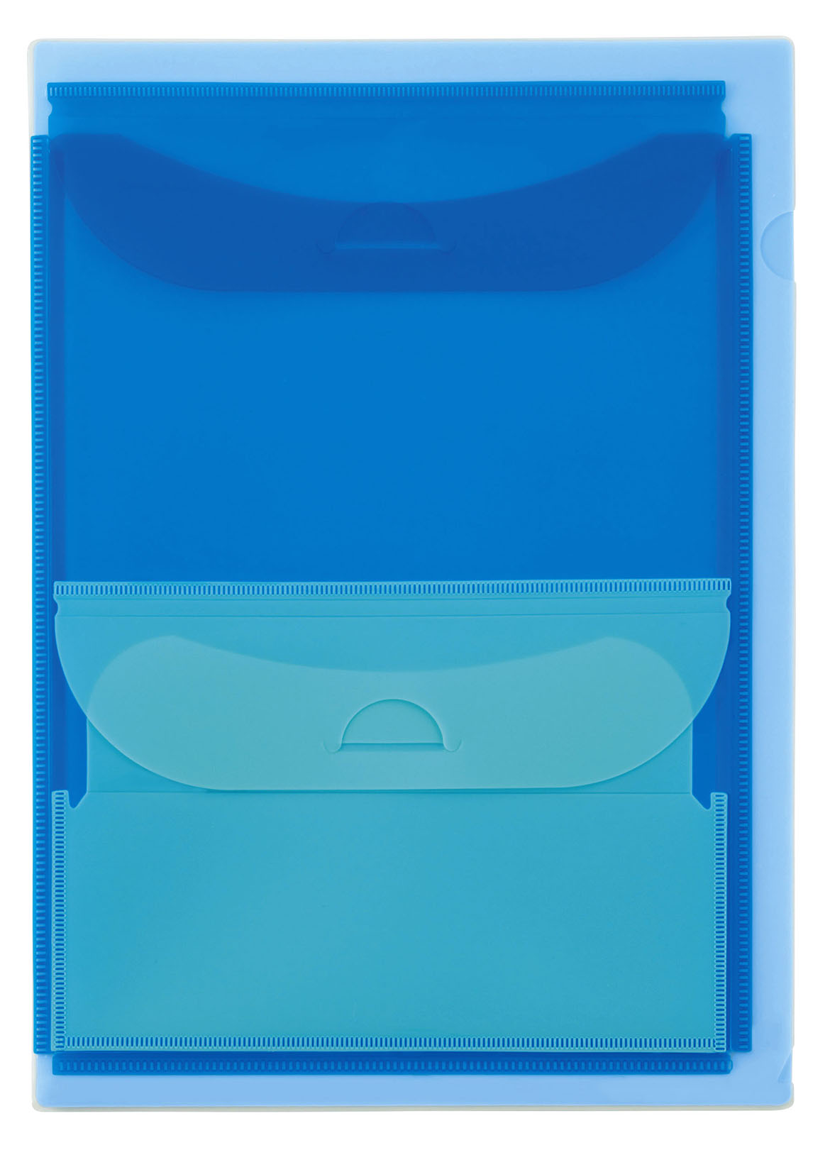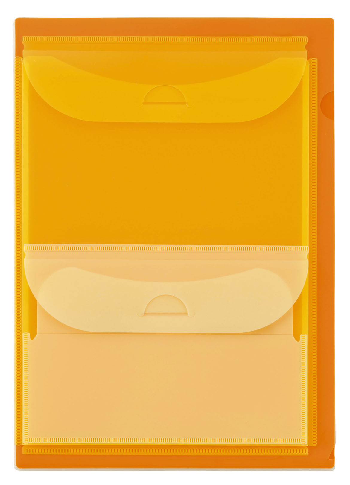 A4判クリアーホルダーの上に2つのポケットが付いており、書類から小物まで1冊で整理ができます。