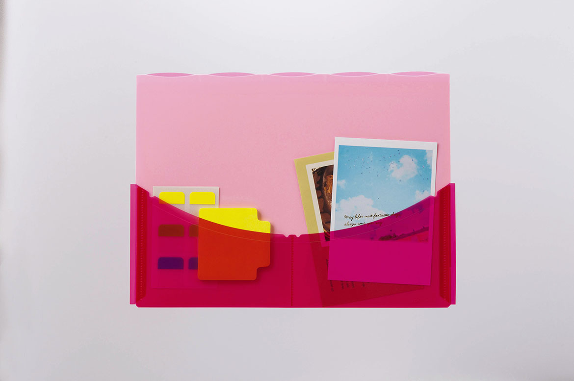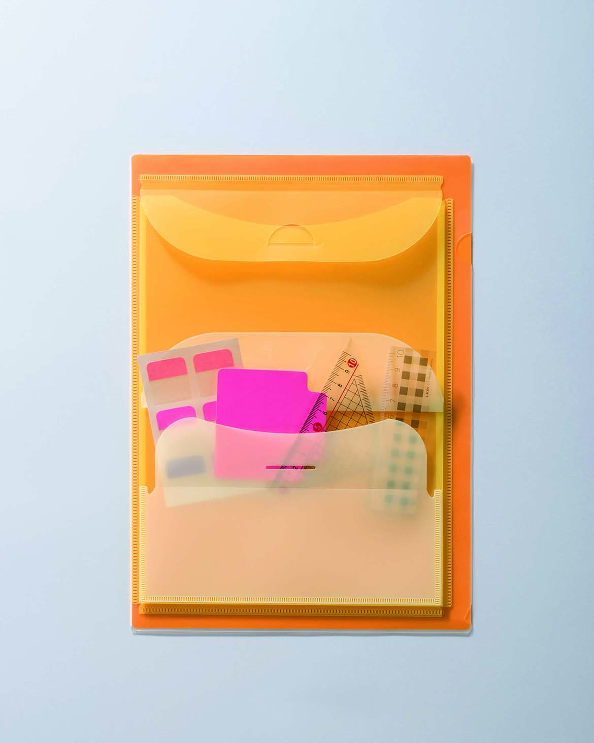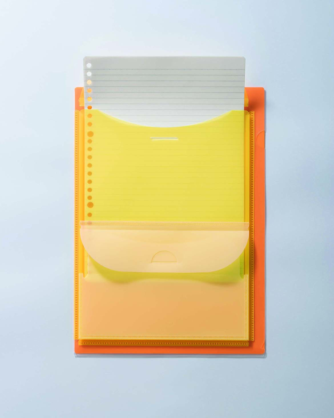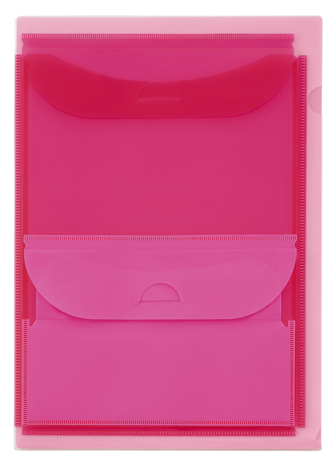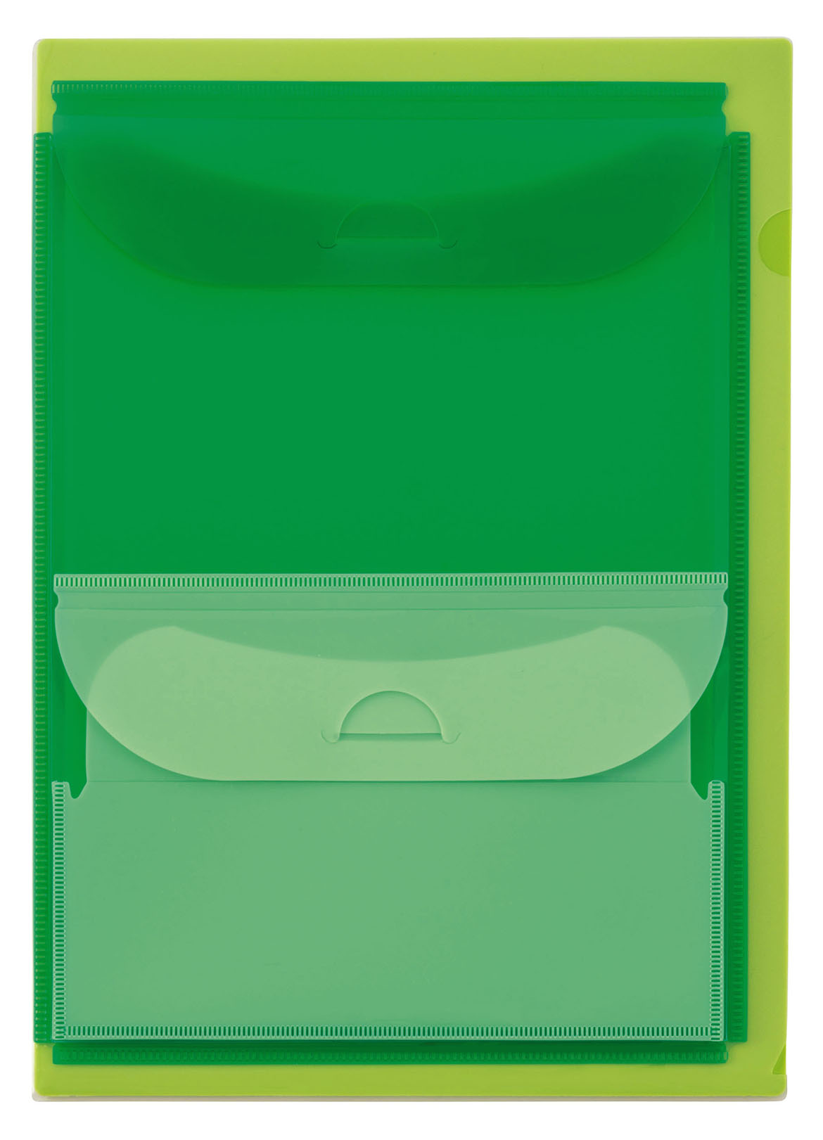 A4判クリアーホルダーの上に2つのポケットが付いており、書類から小物まで1冊で整理ができます。