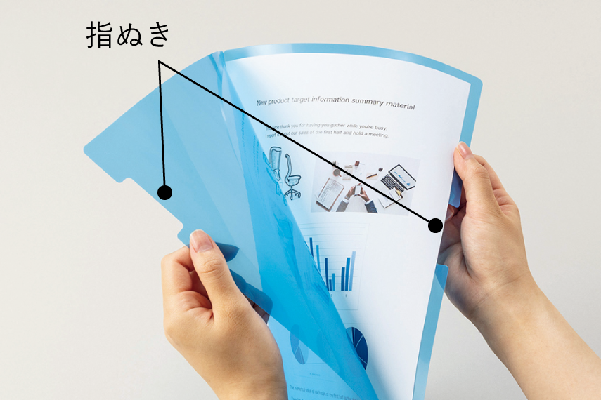 表・裏 どちらのシートにも指ぬき加工が施されているので、利き手に関係なく、右手でも左手でも書類にアクセスしやすい形状です。