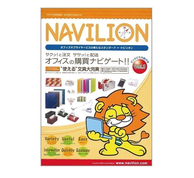 Webでの注文・当日配送が主流となり、オフィス通販サービス「ナビリオン」をスタート。ライオン事務器の商品だけでなくインク・トナーから飲料まで幅広く取り揃え、分かりやすい注文サイトとスピーディーな配送で好評となり、オフィスの購買を支えるツールとして多くのユーザーに親しまれています。