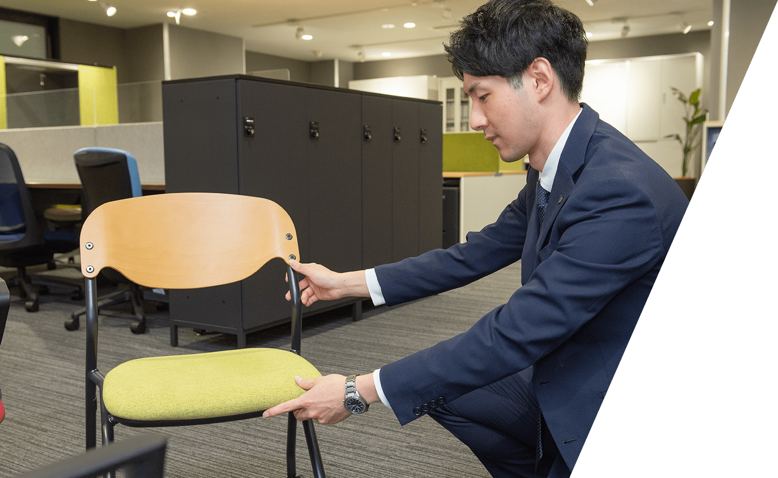 私は入社以来5年間、オフィス家具を手がけるチームに所属しており、2年目からはロッカーや書庫などの収納家具、3年目からはミーティング用チェアーを担当しています。企画から商品化まではだいたい1年ほどかかり、年間ひとりあたり3・4つは企画案を出さなければなりません。新商品の企画案を考えるかたわら、会議を通った企画の試作を進めたり、できあがった商品の撮影対応をしたりと、担当商品のさまざまな工程に同時進行で関わることになります。スケジュール管理をしっかり行いながら、臨機応変に対応するよう心がけています。