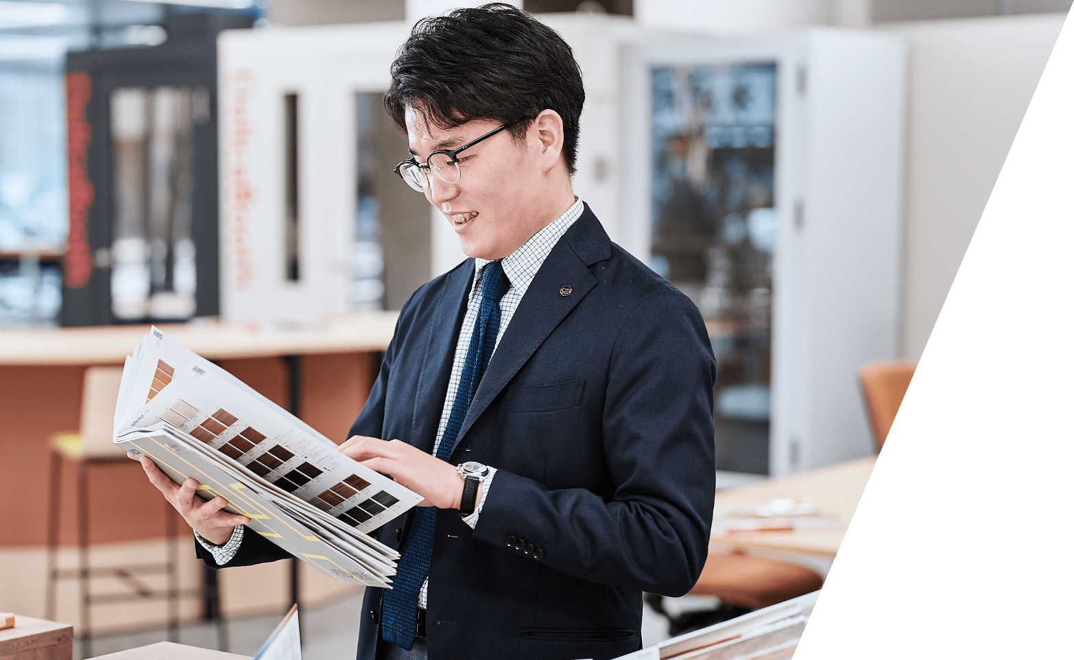 学生時代はインテリアを専攻し、家具製作も行っていました。家具を一からデザインし、木を切ったり穴を開けたりと、自分の手で作っていくことに楽しさを感じ、在学中から家具メーカーへの就職を考えていました。そんな中、参加したイベントで製作した作品を一般の方に評価していただく機会があり、自分で作ったもので社会に貢献したいと思うようになりました。その出来事がきっかけで、家具だけではなくもっと広範囲に貢献できる空間デザインに興味を持つようになりました。最初は飲食店や商業施設に目を向けていたのですが、あるとき、オフィスは1日で利用する時間が他の場所よりも比較的長く、居心地の良さを追求すれば多くの人の役に立てるのではないかと気づきました。