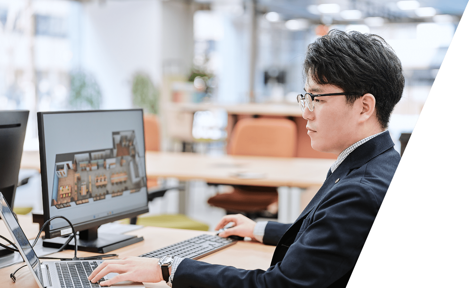 現在は、オフィス空間のデザイナーをしています。お客様の要望とオフィスの用途、規模に合わせてCADを使って設計・デザインし、オフィス家具をどこに配置するかを決めるゾーニングを含めた全体のデザインが主な仕事です。空間をデザインする際には、円滑なコミュニケーションを求めるお客様であればすれ違うたびに誰かと顔を合わせられるオフィス家具の配置にするなど、完成後のイメージやストーリーをしっかりと思い描きながら、少しずつカタチにしていきます。