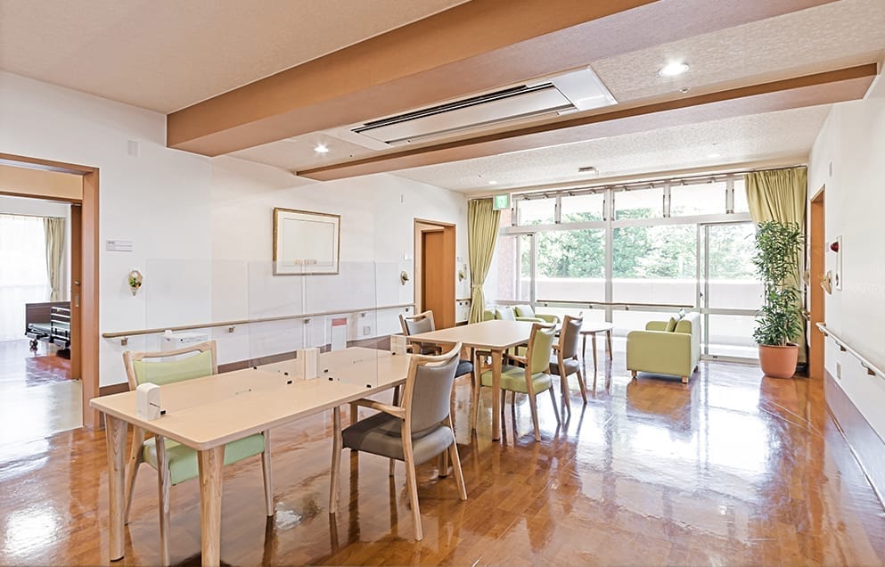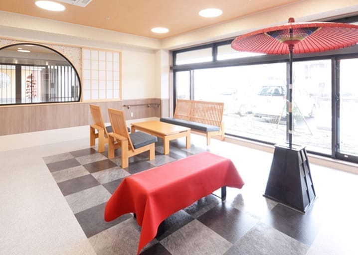エントランスには野点や茶屋のイメージ装飾と共に縦格子の家具を配置。デイルームにはシックな色調を配し、落ち着いた住空間を実現。