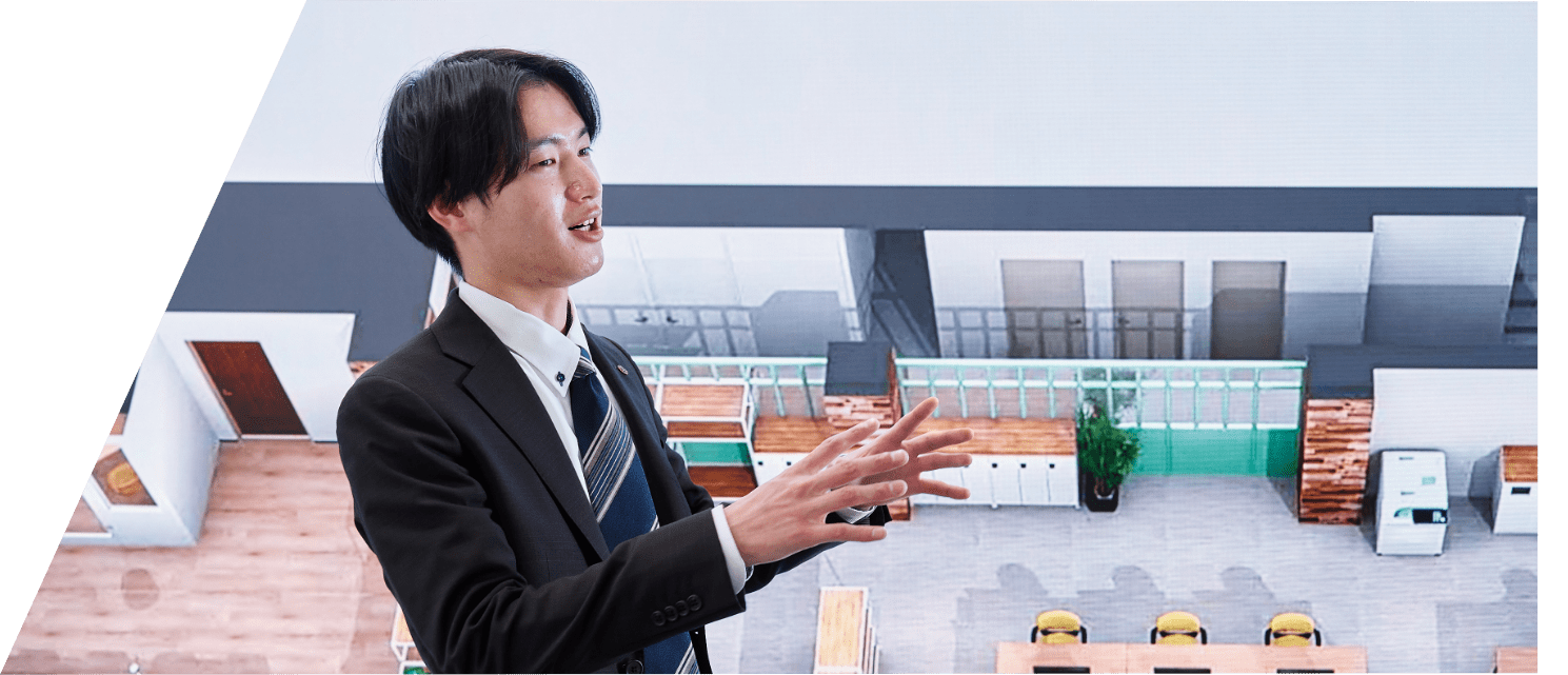 お客様のニーズを汲み取り、家具・壁・床・オーダーメイド家具のデザインも含めた空間のトータルコーディネートを行います。レイアウト図面やCGを製作するほか、営業と一緒にお客様先まで同行し、ヒアリングをして最適な提案を行います。